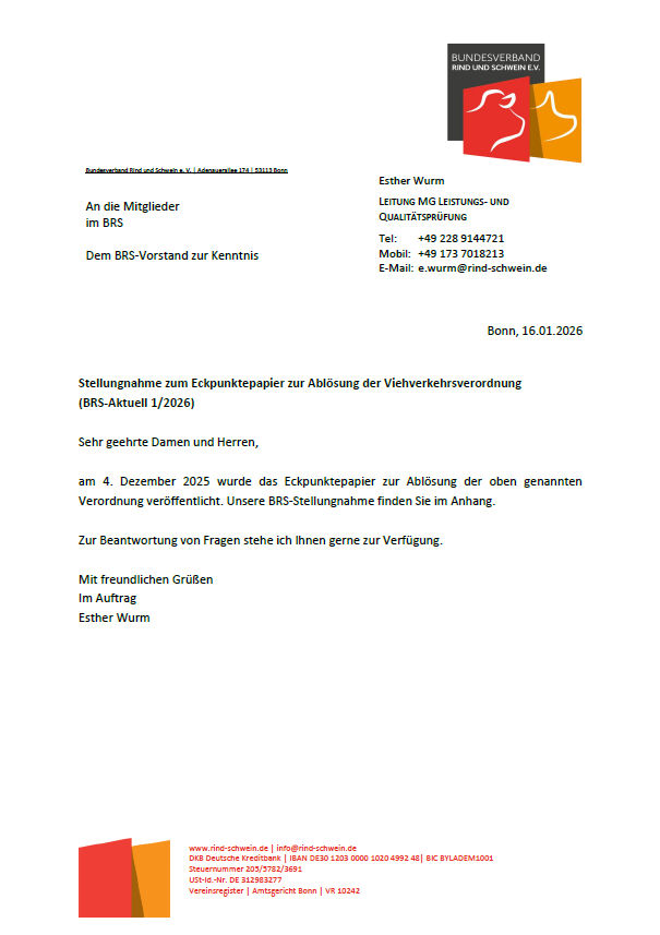 | 16.07.2025 | Stellungnahme des Bundesverbandes Rind und Schwein zum Antrag des Landes Nordrhein-Westfalen - Entschließung des Bundesrates Tierschutz bei Tiertransporten und beim Export von Nutztieren in Drittstaaten sicherstellen |