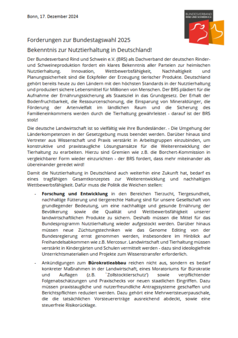 als weiterer Schutzmechanismus, der eingreift, wenn die Importe um 5 % zunehmen oder die Preise um 5 % fallen. In diesem Fall können Zölle kurzfristig wieder aufgeschlagen werden. Selten wurde ein Thema jedoch so emotional und kontrovers diskutiert – auch innerhalb der Landwirtschaft. Es ist eine Frage des Prinzips: Seit Jahren steigen die Ansprüche an Tierhalter in der EU und allen voran in Deutschland stetig an – Haltungsbedingungen, Tierwohl, Arzneimittel, Umweltauflagen etc. Das Gefühl, von der Fülle an Auflagen erdrückt zu werden, ist allgegenwärtig. Es kombiniert sich nun mit dem Eindruck unfairer Behandlung, denn aufgrund von Mercosur können Erzeugnisse mit anderen Produktionsstandards einfacher in den europäischen Markt gelangen. Aber: Deutsche Ware bleibt weiterhin gefragt. 5xD ist und bleibt eine stabile Bandmauer – sie muss von allen Marktbeteiligten in Deutschland gelebt und eingefordert werden. Um unsere Produktion auch in allen Absatzwegen differenziert aufzeigen zu können, spricht sich der BRS für eine Ausweitung der EU-weiten Herkunftskennzeichnung aus.
